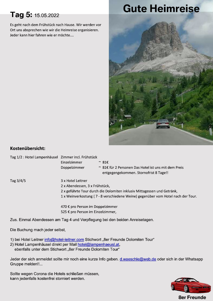 unsere Planung für die Dolomiten Tour 2022 ist fertig. Wer mit mag, einfach melden. Egal mit welchem Auto. wir haben diesesmal den Schwerpunkt Cabrio's... Auch ist die Tour auf max. 10 Fahrzeuge geplant. Soviele Zimmer sind halt geblockt. Sollten es mehr werden, versuchen wir nachzubuchen. Es wird sich dan schon eine Lösung finden...