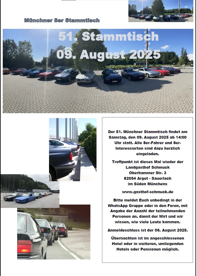 der 51. Münchner Stammtisch findet am Samstag, den 09. August 2025 ab 14:00 Uhr statt. Alle 8er-Fahrer und 8er-Interessierten sind dazu herzlich eingeladen.