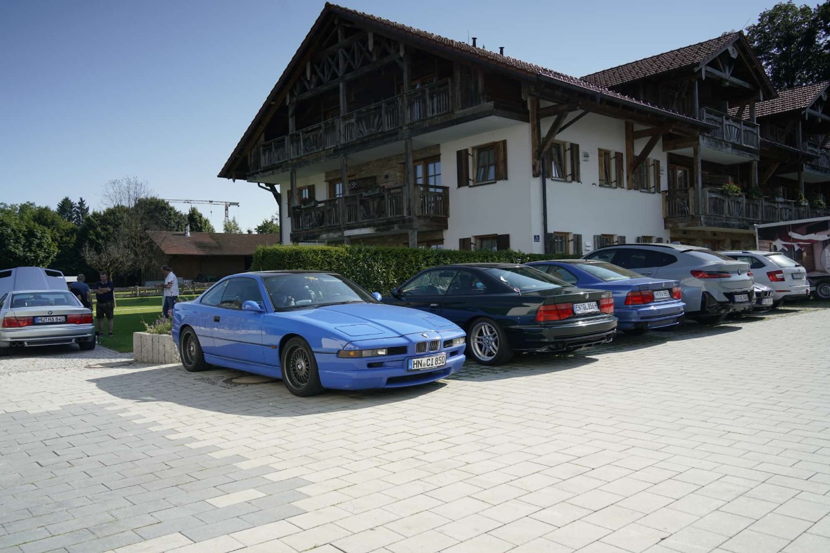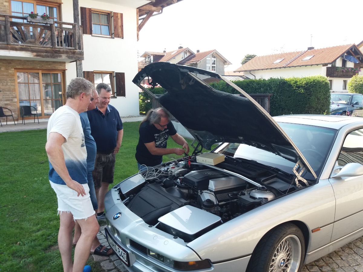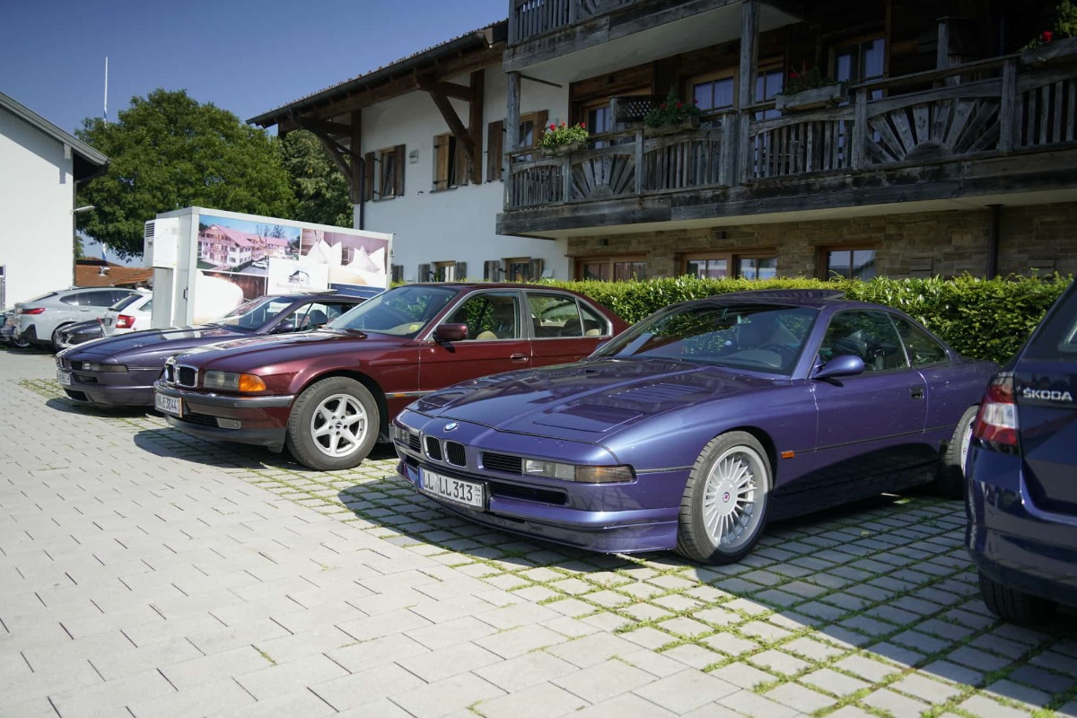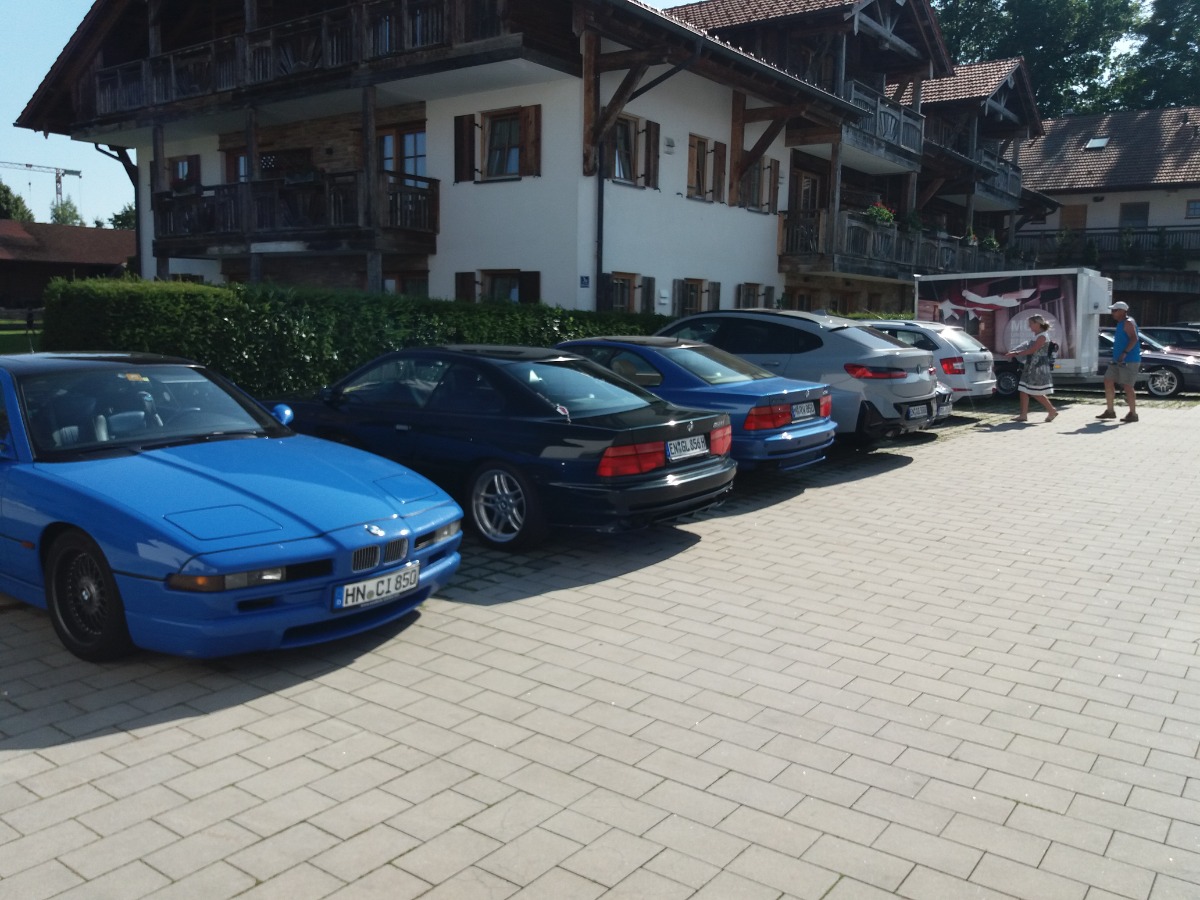Bei Kaiserwetter waren insgesamt 37 Personen, neunzehn E31, davon ein Alpina B12 5.7 (Nr. 57 von 57) ein E38, ein M6, ein Alfa Spyder und ein Porsche 911 beim Stammtisch zugegen.